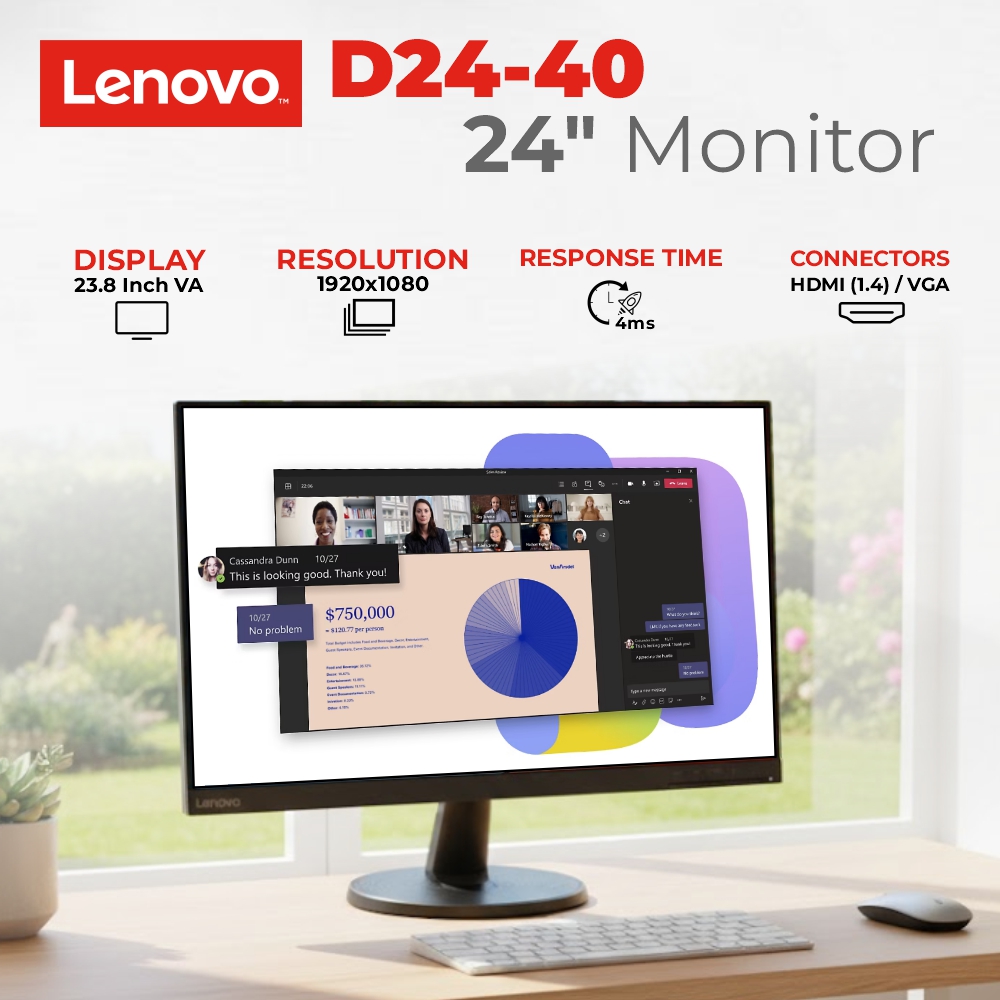 🔘 Pre-owned LENOVO 24-inch D24-40 LED FRAMELESS MONITOR HDMI / VGA