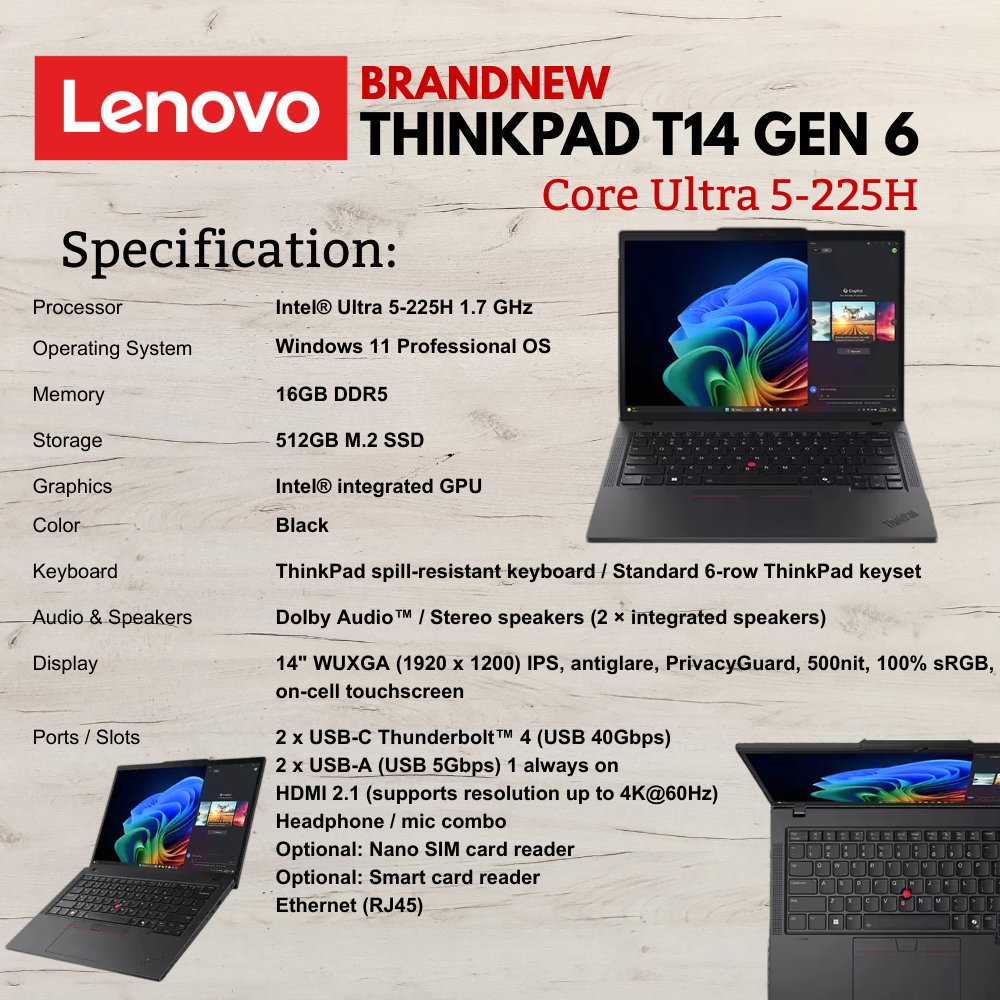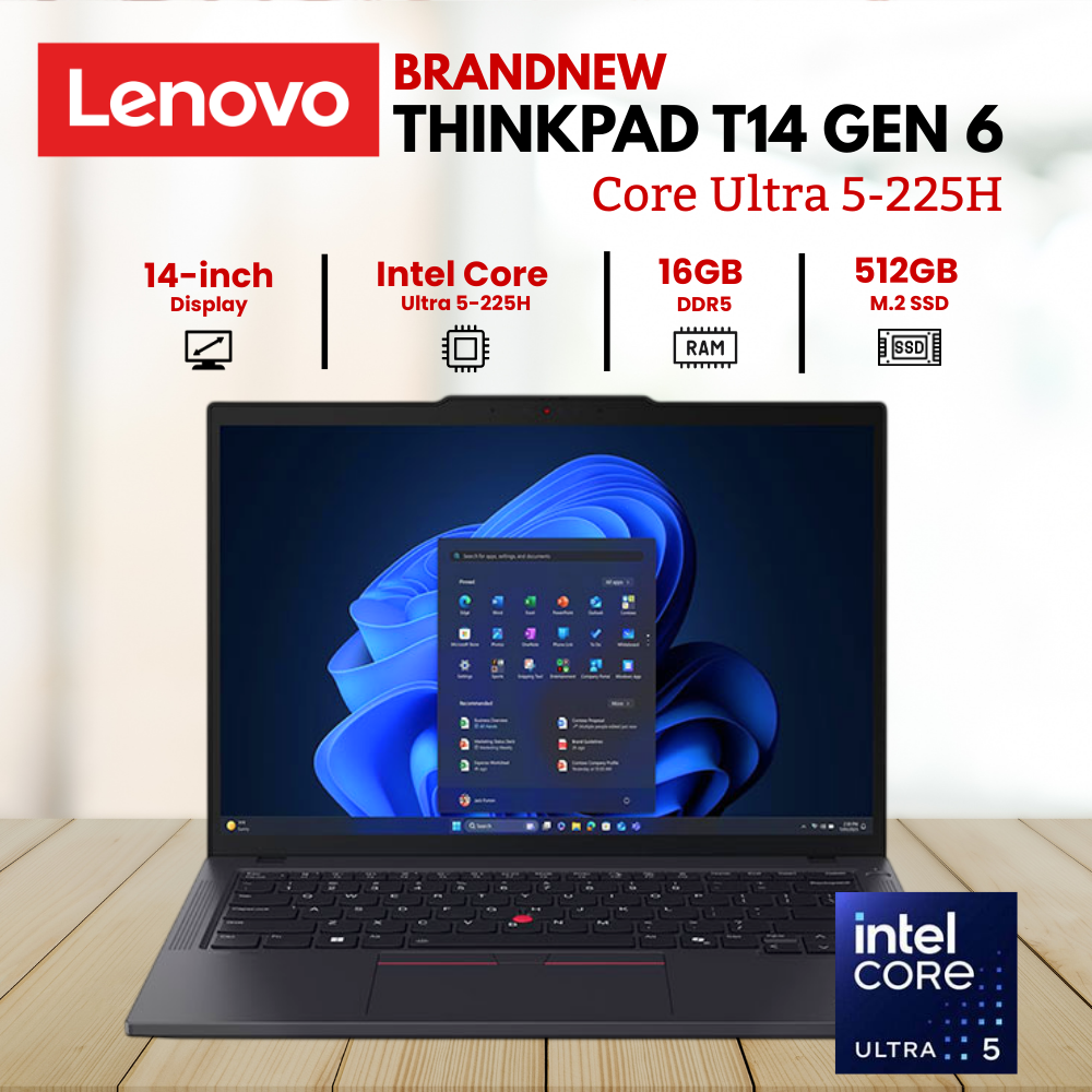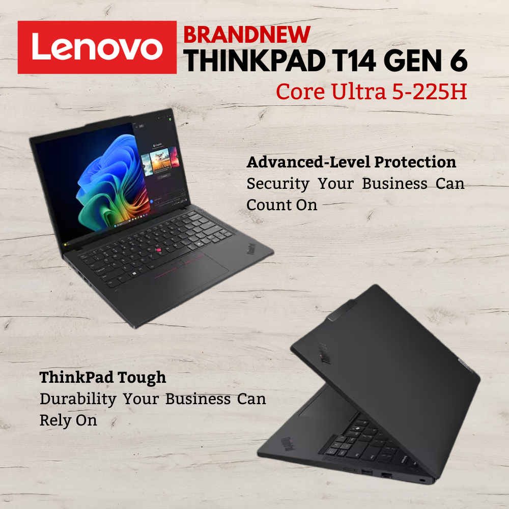 The Brandnew Lenovo ThinkPad T14 Gen 6 is engineered to handle demanding tasks with ease. Powered by the latest Intel® Core™ Ultra 5-225H processor, this laptop ensures smooth multitasking, faster processing, and improved efficiency for office work, business applications, and creative tasks.