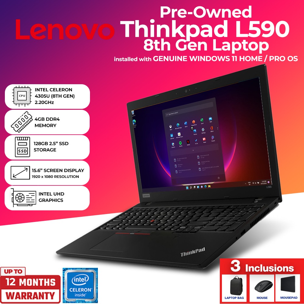 Pre-Owned Lenovo ThinkPad L590 8th Gen Laptop | Intel Celeron 4305U | 4GB RAM | 128GB SSD | 15.6” FHD | Windows 11