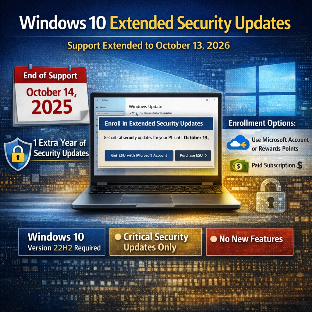 • The Extended Security Updates (ESU) program allows eligible Windows 10 PCs to keep receiving critical security updates until October 13, 2026, giving users one more year of protection after official support ends.