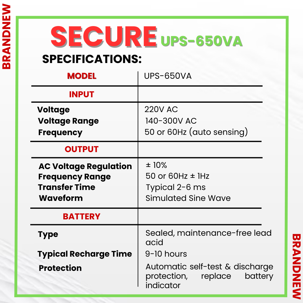 BRANDNEW SECURE UNINTERRUPTIBLE POWER SUPPLY 650VA