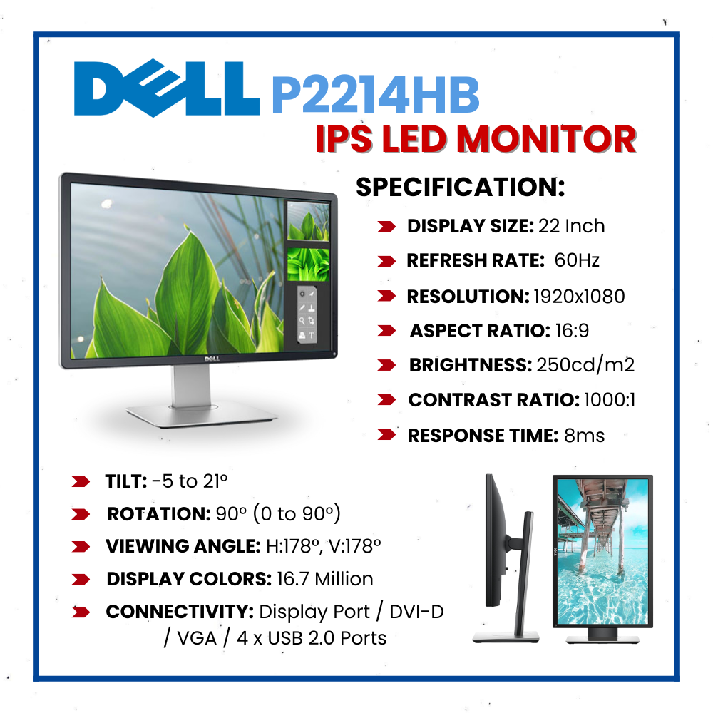 Pre-owned DELL P2214HB IPS LED Monitor with Pivot Function