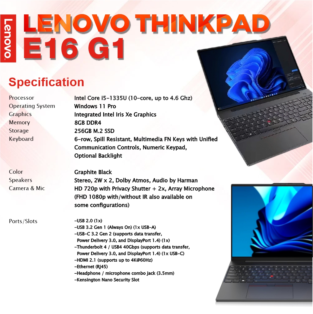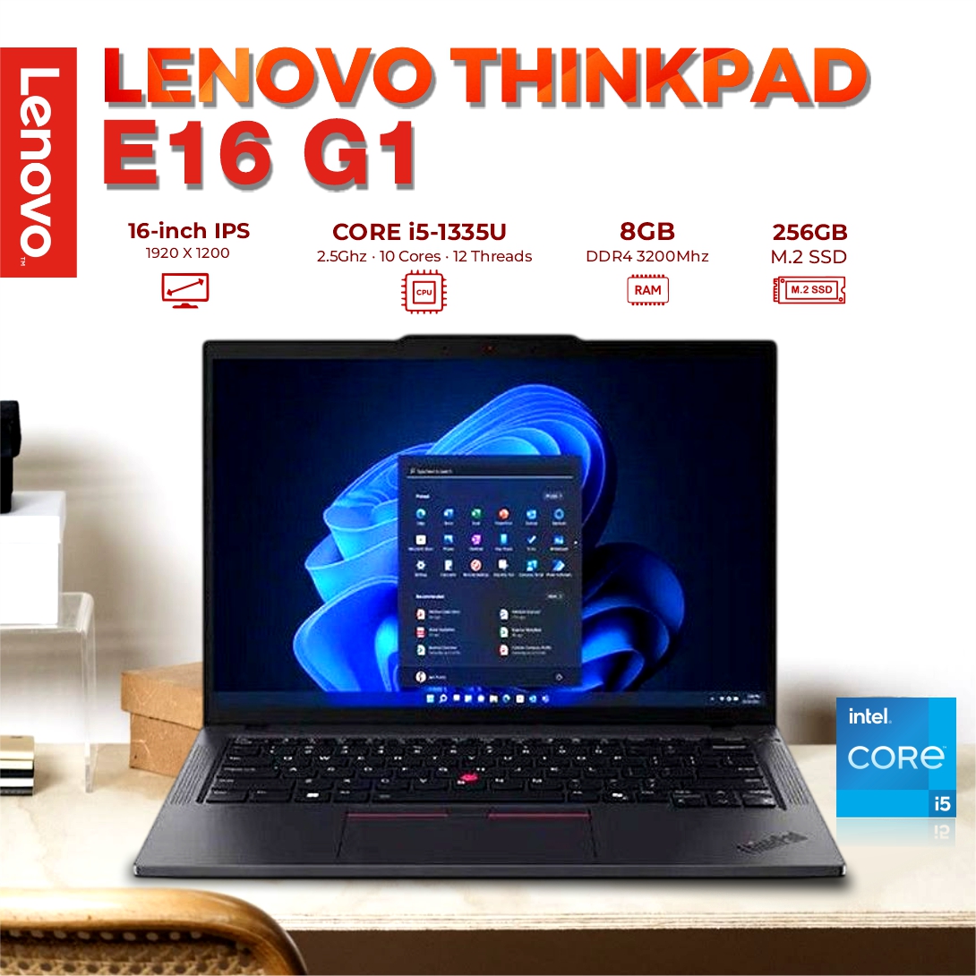 BrandNew LENOVO THINKPAD E16 G1 (Raptor Lake) Intel Core i5-1335U / 8GB DDR4-3200MHz / 256GB M.2 PCIe SSD with Installed Windows 11 Pro